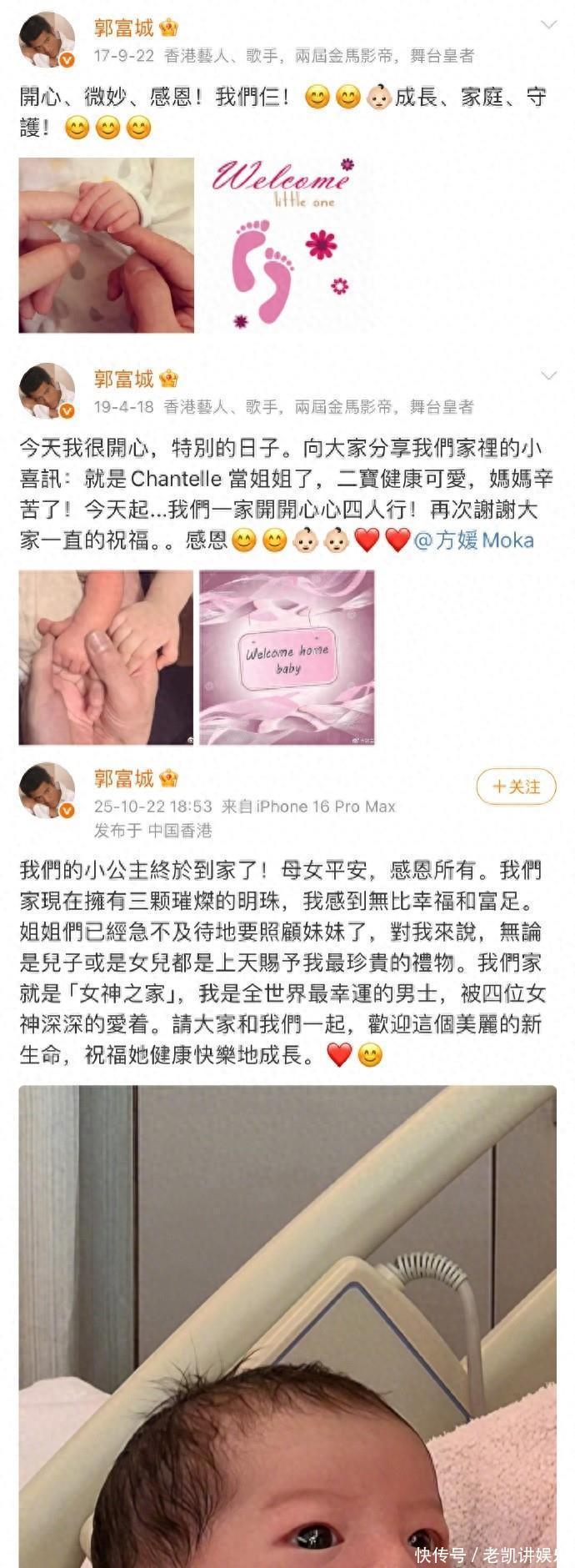 2025 年 10 月 22 号郭富城官宣三胎生女儿,直接把 “四大天王” 的话题炸上热搜!不是因为新歌新戏,是大家突然发现 —— 这四位曾经在舞台上帅到发光的王者,膝下 7 个孩子居然全是女儿!“四大天王” 彻底变成 “四大岳父”,这巧合谁看了不喊一句 “太绝了”!先说说这 “岳父天团” 的神仙配置:郭富城 60 岁,现在有三个女儿,大的 8 岁,老二 6 岁,刚出生的老三还没公布名字,他官宣时直接甜哭:“我们家就是‘女神之家’,我是全世界最幸运的男士,被四位女神爱着”;张学友 64 岁,两个女儿都长大了,大女儿 25 岁,小的 20 岁,为了陪女儿他早就减产,多少演出邀约都婉拒,被网友说是 “烟火人间里的静好传说”;刘德华 64 岁,就一个 13 岁的独生女刘向蕙,把隐私护得严严实实,还特意选免考试学校,私下被拍到蹲在书桌前辅导作业,哪有半分舞台上的 “华仔” 架子;黎明 59 岁,女儿 7 岁,没公开名字,之前晒女儿照片还幽默调侃 “好胖呵呵,平凡是她的运气”,反差萌直接拉满。